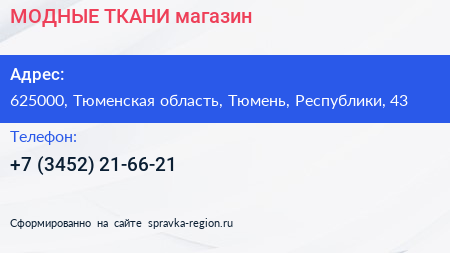 МОДНЫЕ ТКАНИ, магазин по адресу 625000, Тюменская область, Тюмень, Республики, 43 в дальнейшем Организация, размещена в следующих категориях: