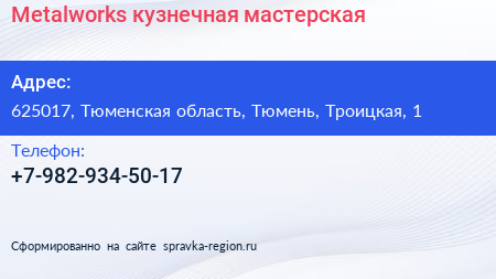 Metalworks, кузнечная мастерская по адресу 625017, Тюменская область, Тюмень, Троицкая, 1 в дальнейшем Организация, размещена в следующих категориях: