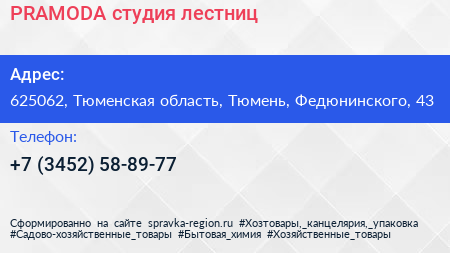 PRAMODA, студия лестниц по адресу 625062, Тюменская область, Тюмень, Федюнинского, 43 в дальнейшем Организация, размещена в следующих категориях: