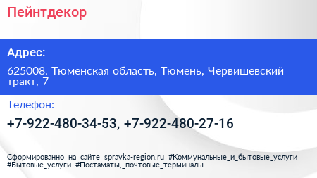 Пейнтдекор по адресу 625008, Тюменская область, Тюмень, Червишевский тракт, 7 в дальнейшем Организация, размещена в следующих категориях: