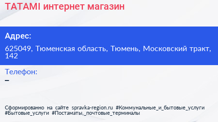 TATAMI, интернет-магазин по адресу 625049, Тюменская область, Тюмень, Московский тракт, 142 в дальнейшем Организация, размещена в следующих категориях: