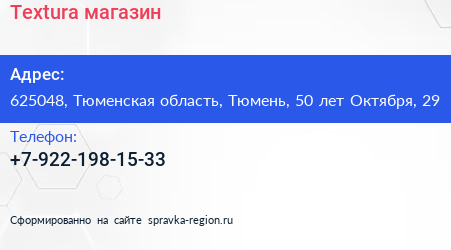 Textura, магазин по адресу 625048, Тюменская область, Тюмень, 50 лет Октября, 29 в дальнейшем Организация, размещена в следующих категориях: