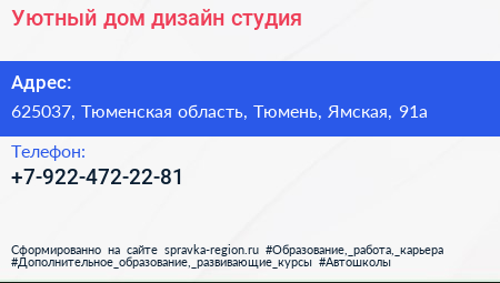 Уютный дом, дизайн-студия по адресу 625037, Тюменская область, Тюмень, Ямская, 91а в дальнейшем Организация, размещена в следующих категориях: