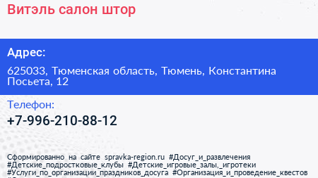 Витэль, салон штор по адресу 625033, Тюменская область, Тюмень, Константина Посьета, 12 в дальнейшем Организация, размещена в следующих категориях: