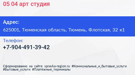 05.04, арт-студия по адресу 625001, Тюменская область, Тюмень, Флотская, 32 к1 в дальнейшем Организация, размещена в следующих категориях: