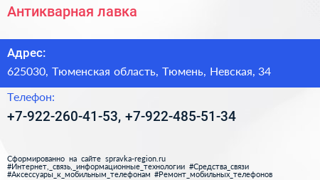 Антикварная лавка по адресу 625030, Тюменская область, Тюмень, Невская, 34 в дальнейшем Организация, размещена в следующих категориях: