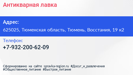 Антикварная лавка по адресу 625025, Тюменская область, Тюмень, Восстания, 19 к2 в дальнейшем Организация, размещена в следующих категориях:
