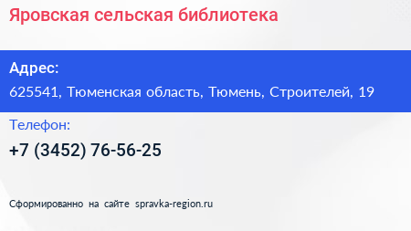 Яровская сельская библиотека по адресу 625541, Тюменская область, Тюмень, Строителей, 19 в дальнейшем Организация, размещена в следующих категориях: