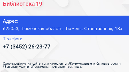 Библиотека №19 по адресу 625053, Тюменская область, Тюмень, Станционная, 18а в дальнейшем Организация, размещена в следующих категориях: