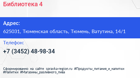 Библиотека №4 по адресу 625031, Тюменская область, Тюмень, Ватутина, 14/1 в дальнейшем Организация, размещена в следующих категориях: