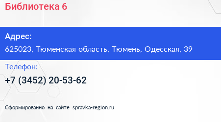 Библиотека №6 по адресу 625023, Тюменская область, Тюмень, Одесская, 39 в дальнейшем Организация, размещена в следующих категориях: