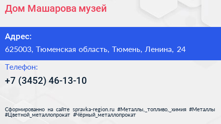 Дом Машарова, музей по адресу 625003, Тюменская область, Тюмень, Ленина, 24 в дальнейшем Организация, размещена в следующих категориях: