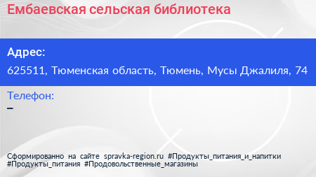 Ембаевская сельская библиотека по адресу 625511, Тюменская область, Тюмень, Мусы Джалиля, 74 в дальнейшем Организация, размещена в следующих категориях: