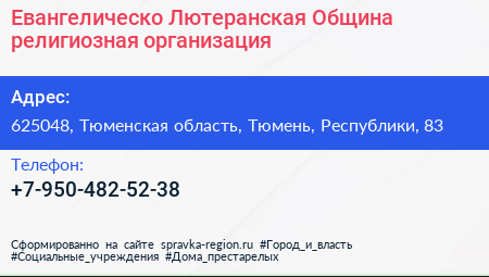Евангелическо-Лютеранская Община, религиозная организация по адресу 625048, Тюменская область, Тюмень, Республики, 83 в дальнейшем Организация, размещена в следующих категориях: