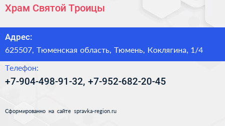 Храм Святой Троицы по адресу 625507, Тюменская область, Тюмень, Коклягина, 1/4 в дальнейшем Организация, размещена в следующих категориях:
