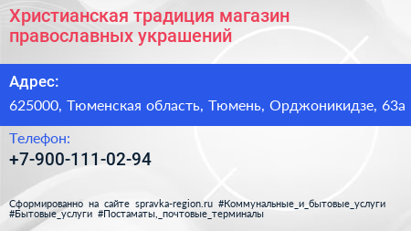 Христианская традиция, магазин православных украшений по адресу 625000, Тюменская область, Тюмень, Орджоникидзе, 63а в дальнейшем Организация, размещена в следующих категориях:
