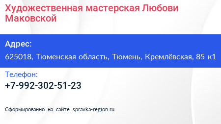 Художественная мастерская Любови Маковской по адресу 625018, Тюменская область, Тюмень, Кремлёвская, 85 к1 в дальнейшем Организация, размещена в следующих категориях: