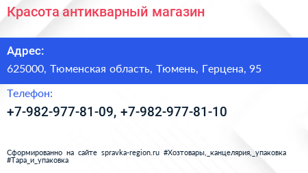 Красота, антикварный магазин по адресу 625000, Тюменская область, Тюмень, Герцена, 95 в дальнейшем Организация, размещена в следующих категориях: