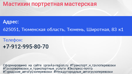 Мастихин, портретная мастерская по адресу 625051, Тюменская область, Тюмень, Широтная, 83 к1 в дальнейшем Организация, размещена в следующих категориях: