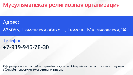 Мусульманская религиозная организация по адресу 625055, Тюменская область, Тюмень, Матмасовская, 34Б в дальнейшем Организация, размещена в следующих категориях: