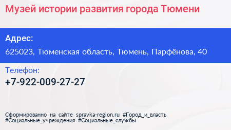 Музей истории развития города Тюмени по адресу 625023, Тюменская область, Тюмень, Парфёнова, 40 в дальнейшем Организация, размещена в следующих категориях: