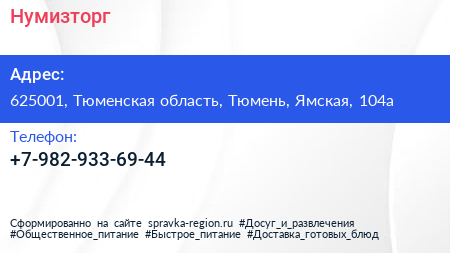 Нумизторг по адресу 625001, Тюменская область, Тюмень, Ямская, 104а в дальнейшем Организация, размещена в следующих категориях: