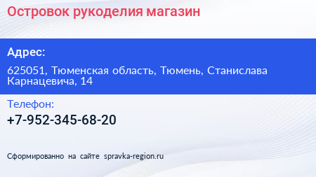 Островок рукоделия, магазин по адресу 625051, Тюменская область, Тюмень, Станислава Карнацевича, 14 в дальнейшем Организация, размещена в следующих категориях: