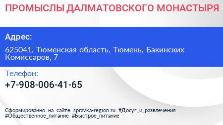ПРОМЫСЛЫ ДАЛМАТОВСКОГО МОНАСТЫРЯ по адресу 625041, Тюменская область, Тюмень, Бакинских Комиссаров, 7 в дальнейшем Организация, размещена в следующих категориях:
