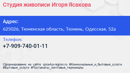 Студия живописи Игоря Ясакова по адресу 625026, Тюменская область, Тюмень, Одесская, 52а в дальнейшем Организация, размещена в следующих категориях: