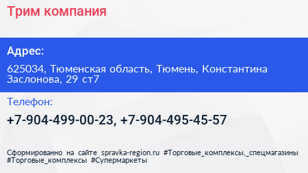 Трим, компания по адресу 625034, Тюменская область, Тюмень, Константина Заслонова, 29 ст7 в дальнейшем Организация, размещена в следующих категориях: