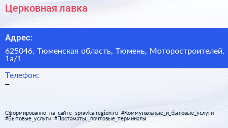 Церковная лавка по адресу 625046, Тюменская область, Тюмень, Моторостроителей, 1а/1 в дальнейшем Организация, размещена в следующих категориях: