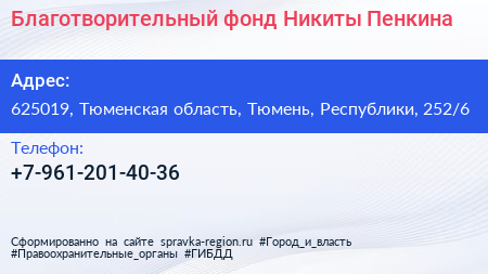 Благотворительный фонд Никиты Пенкина по адресу 625019, Тюменская область, Тюмень, Республики, 252/6 в дальнейшем Организация, размещена в следующих категориях: