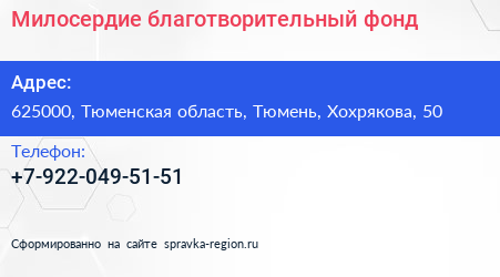 Милосердие, благотворительный фонд по адресу 625000, Тюменская область, Тюмень, Хохрякова, 50 в дальнейшем Организация, размещена в следующих категориях: