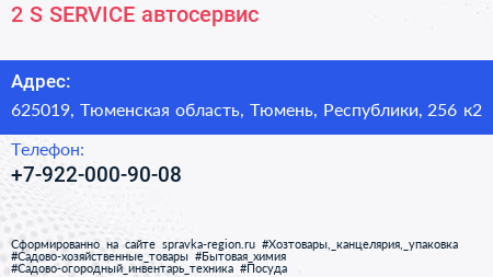 2.S.SERVICE, автосервис по адресу 625019, Тюменская область, Тюмень, Республики, 256 к2 в дальнейшем Организация, размещена в следующих категориях: