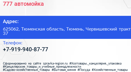 777, автомойка по адресу 625062, Тюменская область, Тюмень, Червишевский тракт, 37 в дальнейшем Организация, размещена в следующих категориях: