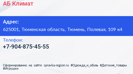 АБ-Климат по адресу 625001, Тюменская область, Тюмень, Полевая, 109 к4 в дальнейшем Организация, размещена в следующих категориях: