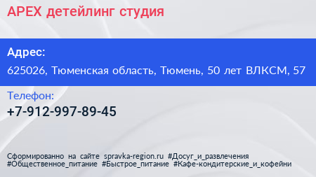 APEX, детейлинг-студия по адресу 625026, Тюменская область, Тюмень, 50 лет ВЛКСМ, 57 в дальнейшем Организация, размещена в следующих категориях: