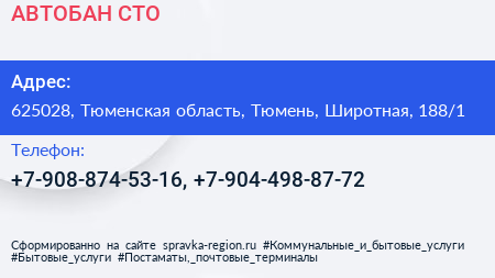 АВТОБАН, СТО по адресу 625028, Тюменская область, Тюмень, Широтная, 188/1 в дальнейшем Организация, размещена в следующих категориях: