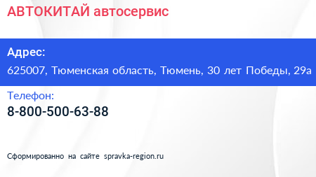 АВТОКИТАЙ, автосервис по адресу 625007, Тюменская область, Тюмень, 30 лет Победы, 29а в дальнейшем Организация, размещена в следующих категориях: