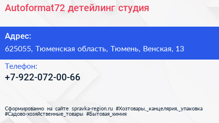 Autoformat72, детейлинг студия по адресу 625055, Тюменская область, Тюмень, Венская, 13 в дальнейшем Организация, размещена в следующих категориях: