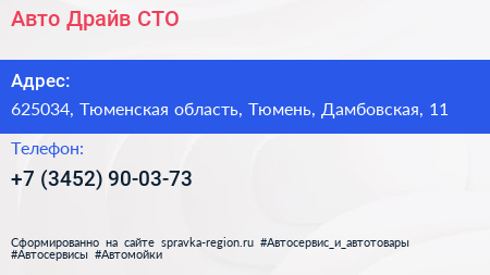 Авто Драйв, СТО по адресу 625034, Тюменская область, Тюмень, Дамбовская, 11 в дальнейшем Организация, размещена в следующих категориях: