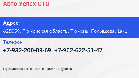 Авто Успех, СТО по адресу 625059, Тюменская область, Тюмень, Голышева, 1а/1 в дальнейшем Организация, размещена в следующих категориях:
