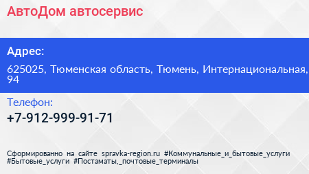 АвтоДом, автосервис по адресу 625025, Тюменская область, Тюмень, Интернациональная, 94 в дальнейшем Организация, размещена в следующих категориях: