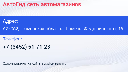 АвтоГид, сеть автомагазинов по адресу 625062, Тюменская область, Тюмень, Федюнинского, 19 в дальнейшем Организация, размещена в следующих категориях:
