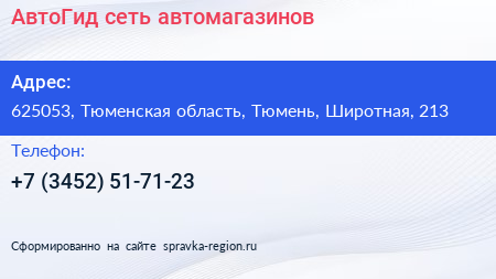 АвтоГид, сеть автомагазинов по адресу 625053, Тюменская область, Тюмень, Широтная, 213 в дальнейшем Организация, размещена в следующих категориях: