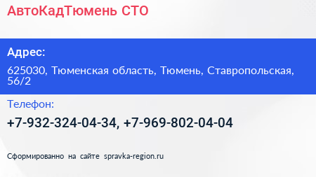 АвтоКадТюмень, СТО по адресу 625030, Тюменская область, Тюмень, Ставропольская, 56/2 в дальнейшем Организация, размещена в следующих категориях: