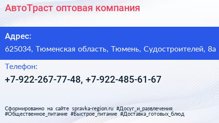 АвтоТраст, оптовая компания по адресу 625034, Тюменская область, Тюмень, Судостроителей, 8а в дальнейшем Организация, размещена в следующих категориях: