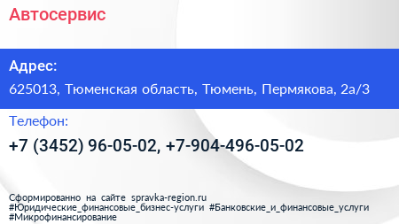 Автосервис по адресу 625013, Тюменская область, Тюмень, Пермякова, 2а/3 в дальнейшем Организация, размещена в следующих категориях: