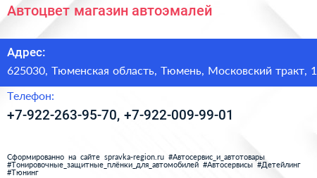 Автоцвет, магазин автоэмалей по адресу 625030, Тюменская область, Тюмень, Московский тракт, 1 в дальнейшем Организация, размещена в следующих категориях: