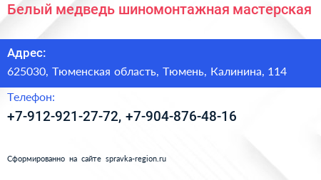 Белый медведь, шиномонтажная мастерская по адресу 625030, Тюменская область, Тюмень, Калинина, 114 в дальнейшем Организация, размещена в следующих категориях: